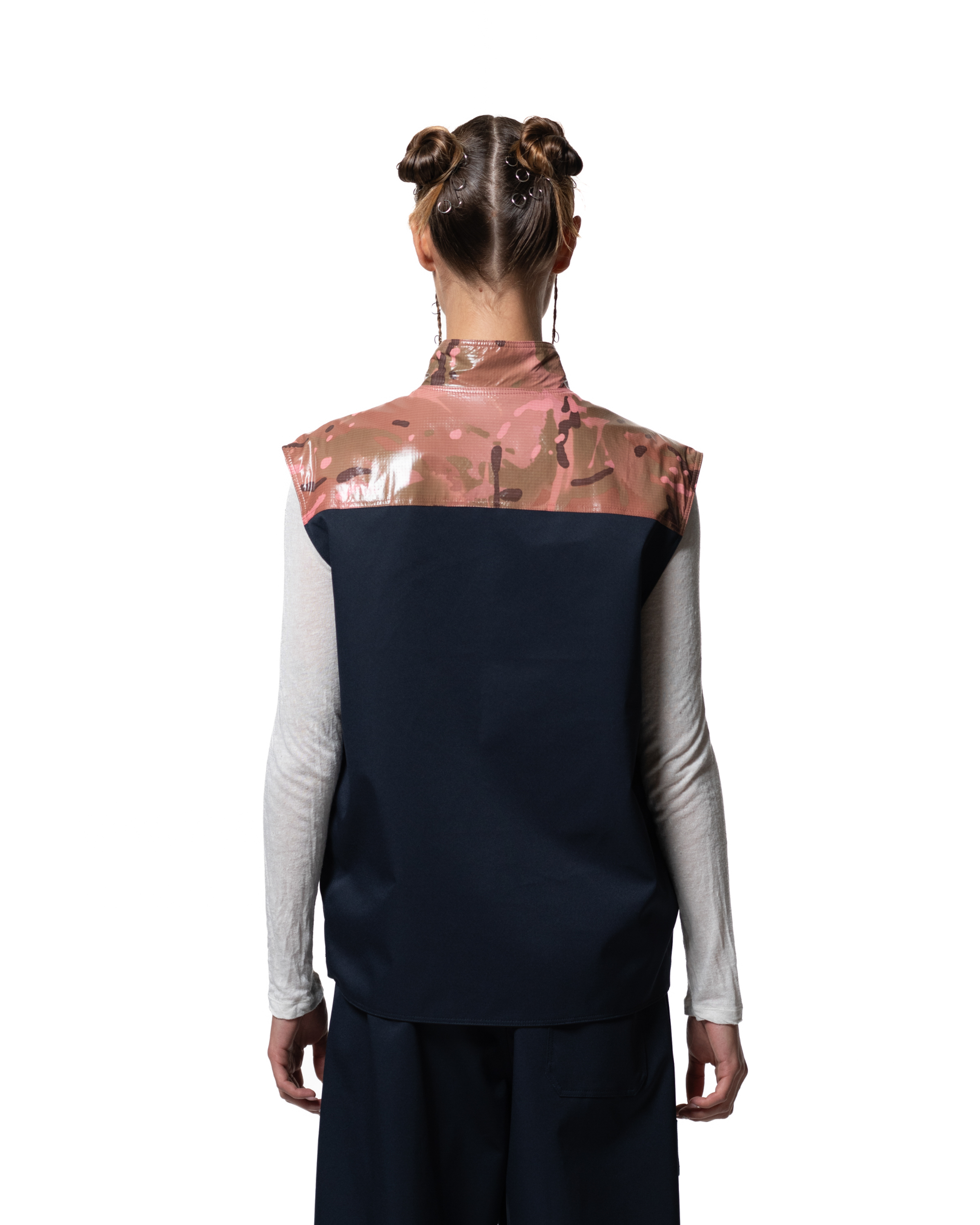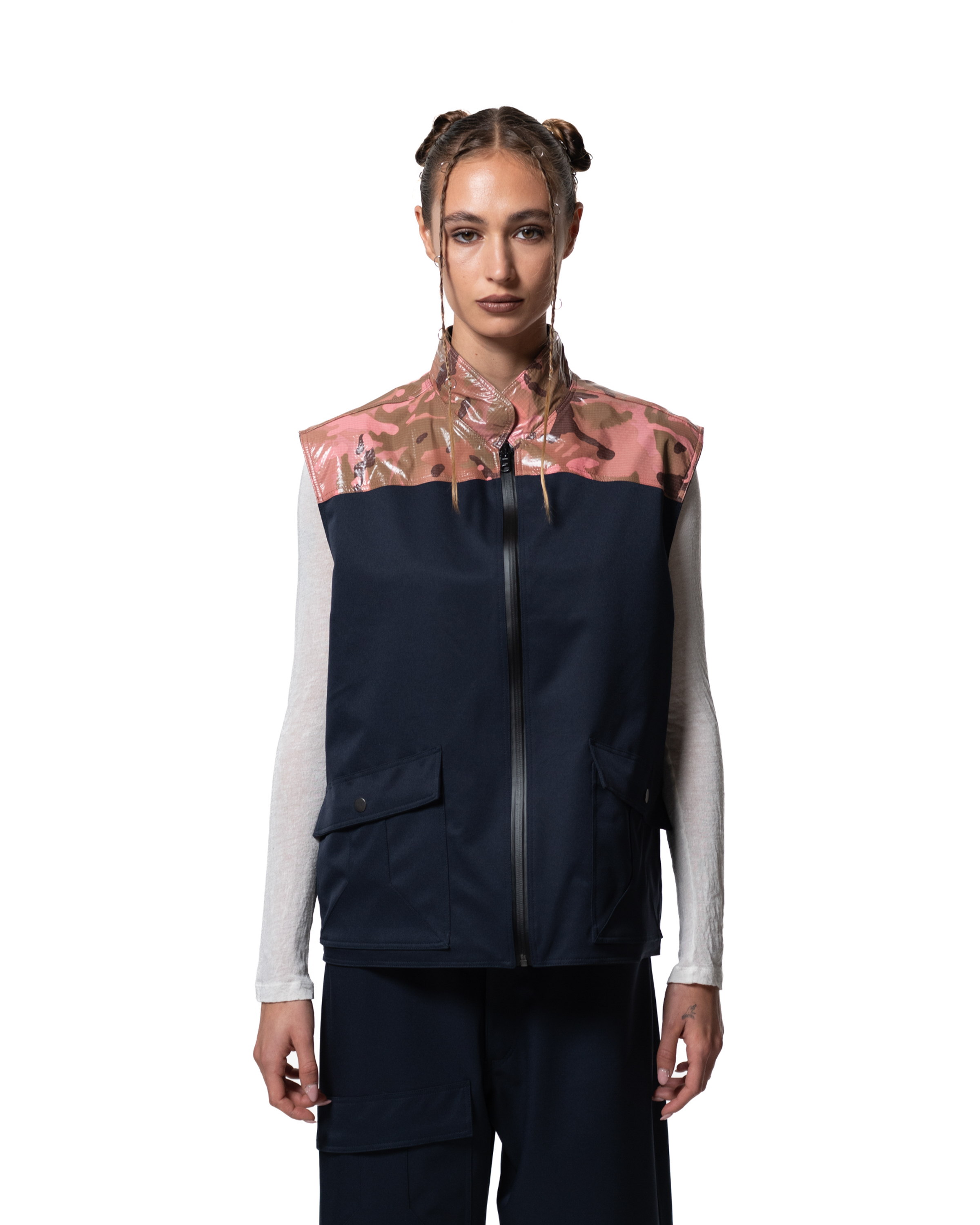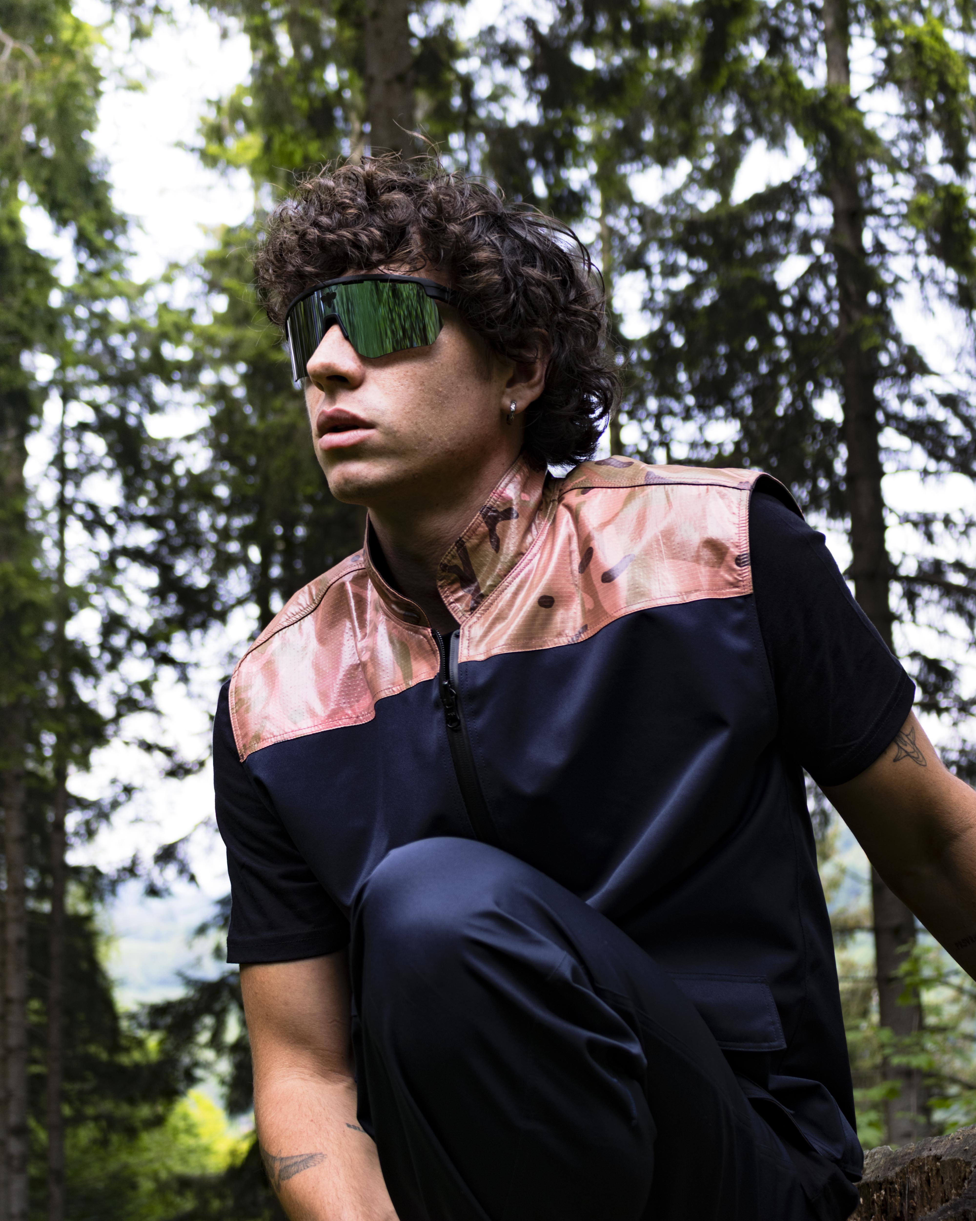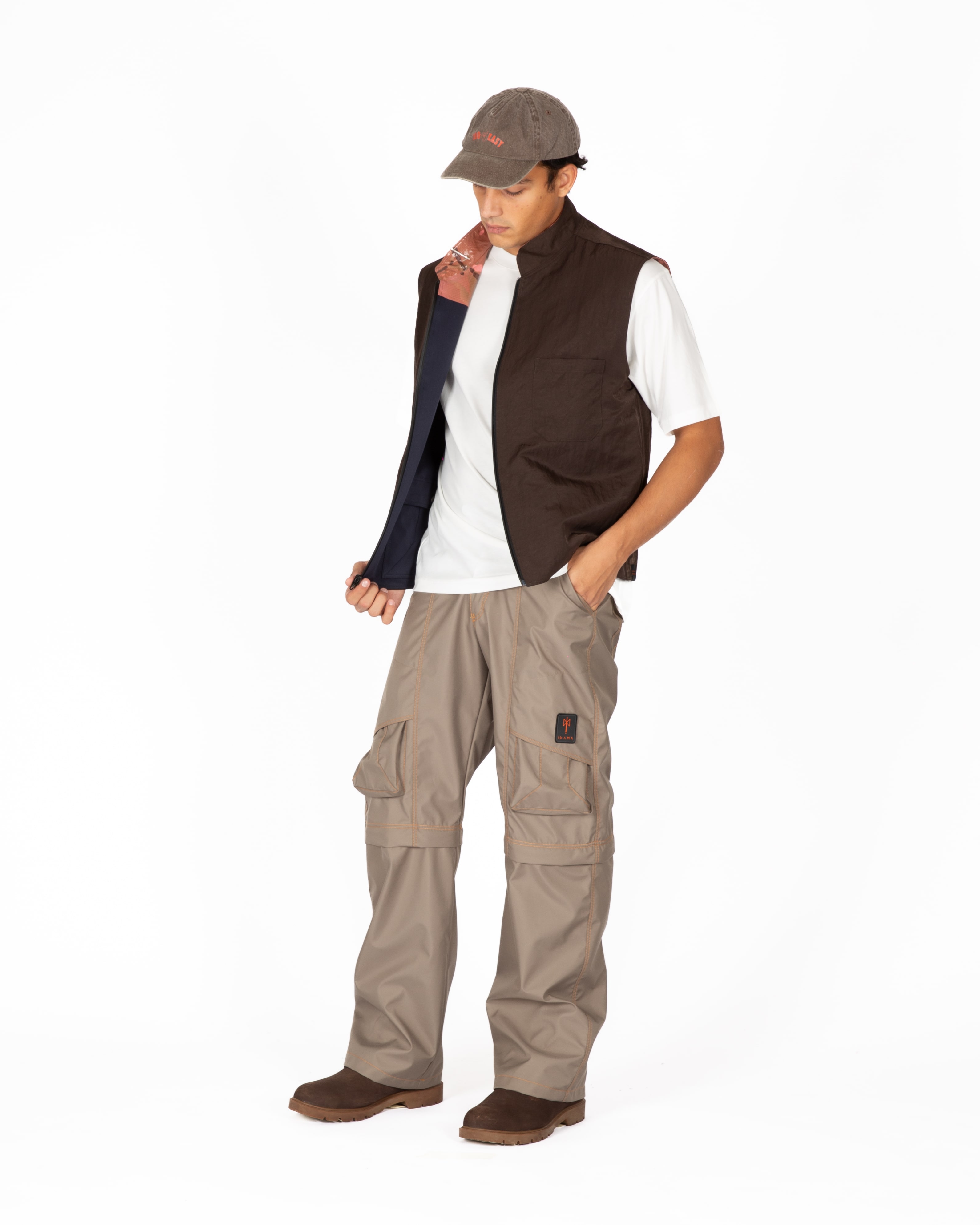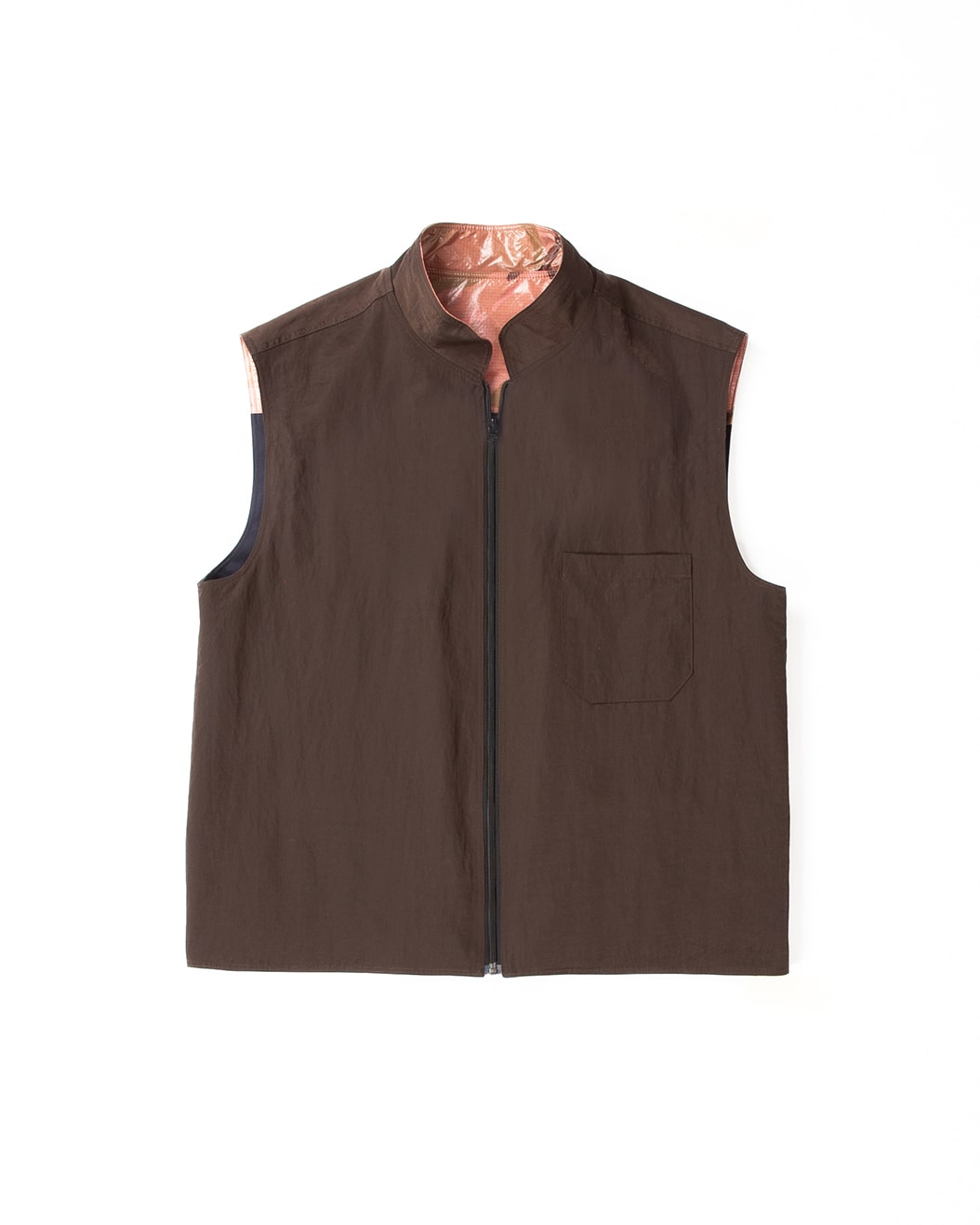Gilet double-face con interno in nylon premium ondulato lucido color marrone ed esterno in tessuto tecnico impermeabile. Un capo versatile che unisce eleganza e funzionalità e che può essere sovrapposto alla giacca defender per una maggiore protezione.