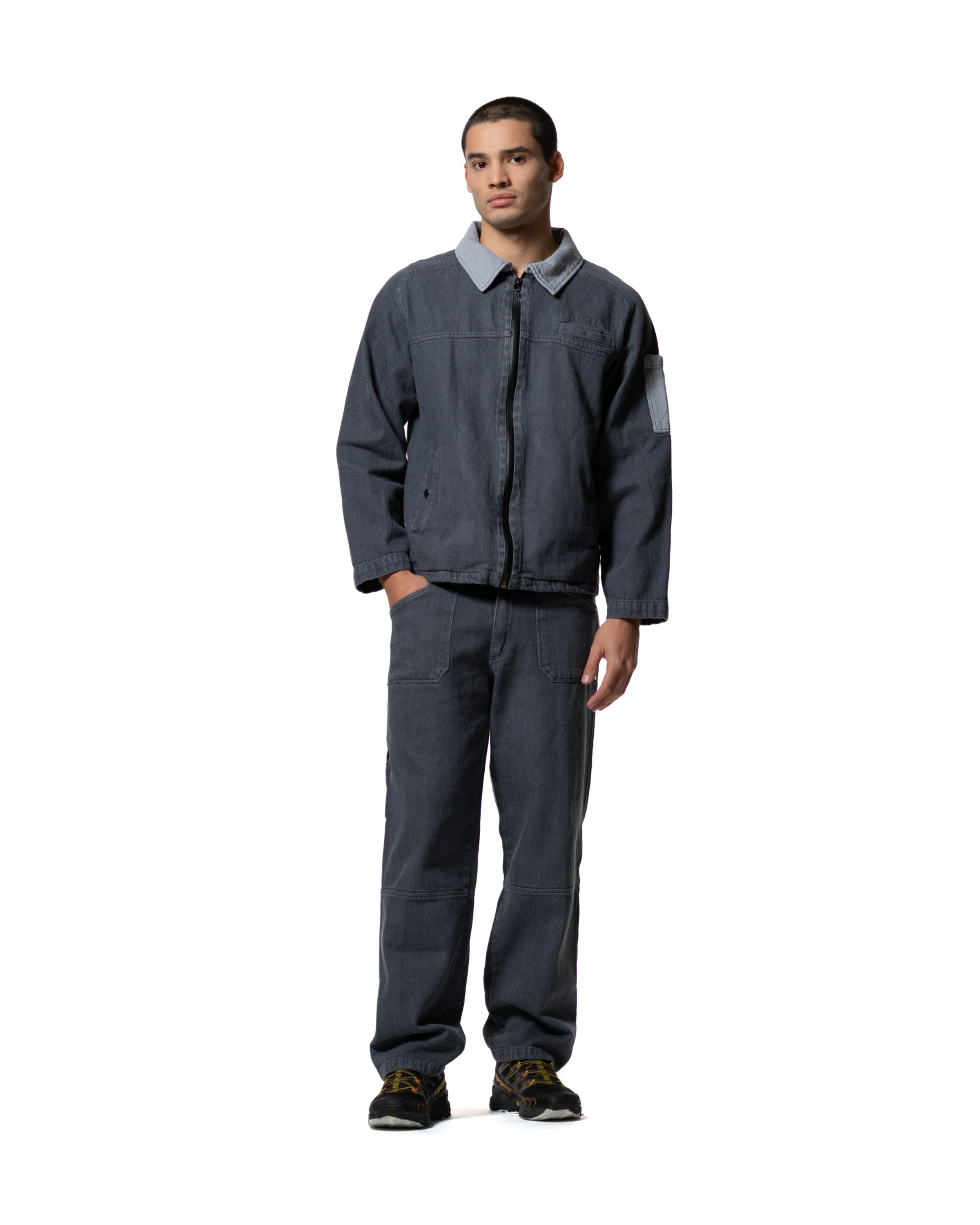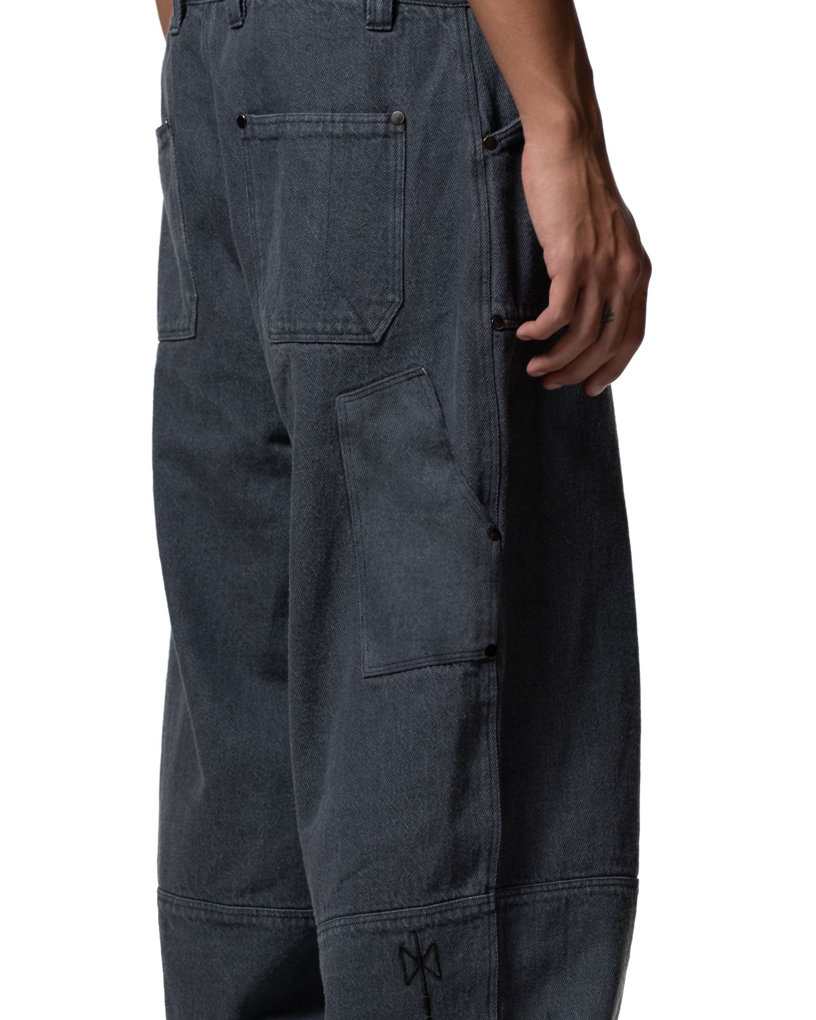 Oversized denim trousers engineered with a five-pocket design and a relaxed, urban silhouette. Crafted in Italy from premium cotton and garment-dyed for depth, each pair undergoes an enzyme wash for a naturally worn-in finish. Reinforced with 16 metal rivets and a sturdy 25 cm zipper, the construction delivers durability with refined edge. Two front pockets, complemented by side and back compartments, ensure functional storage. An embroidered logo on the back calf adds a discreet signature detail.
