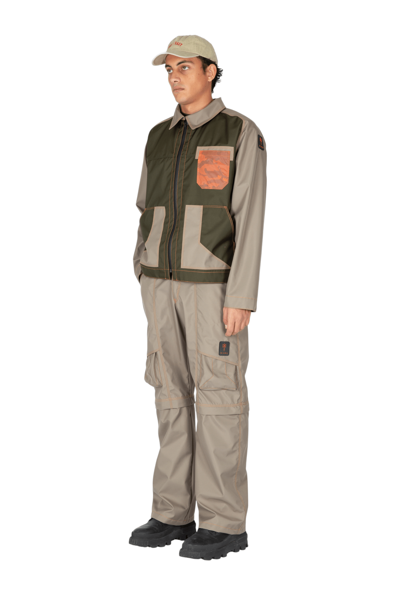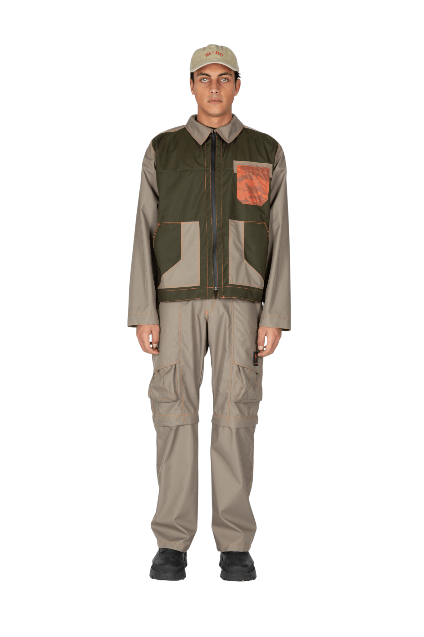 Reinterpretazione della giacca militare in bicolore, realizzata in gabardine riciclata iperdensa con trattamento idrorepellente C-Zero a triplo strato. Design strutturato, per un mix di utilità contemporanea e stile urbano.