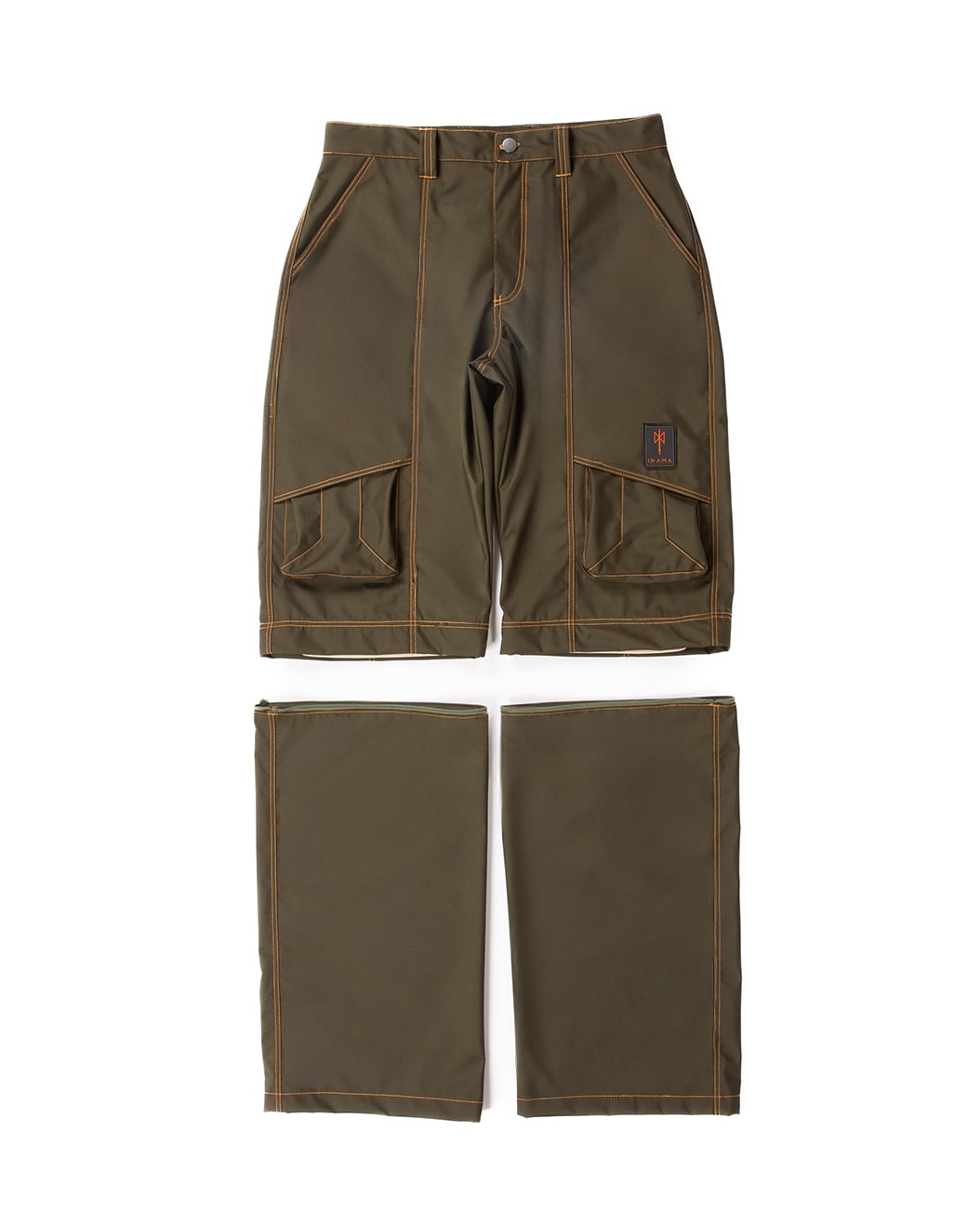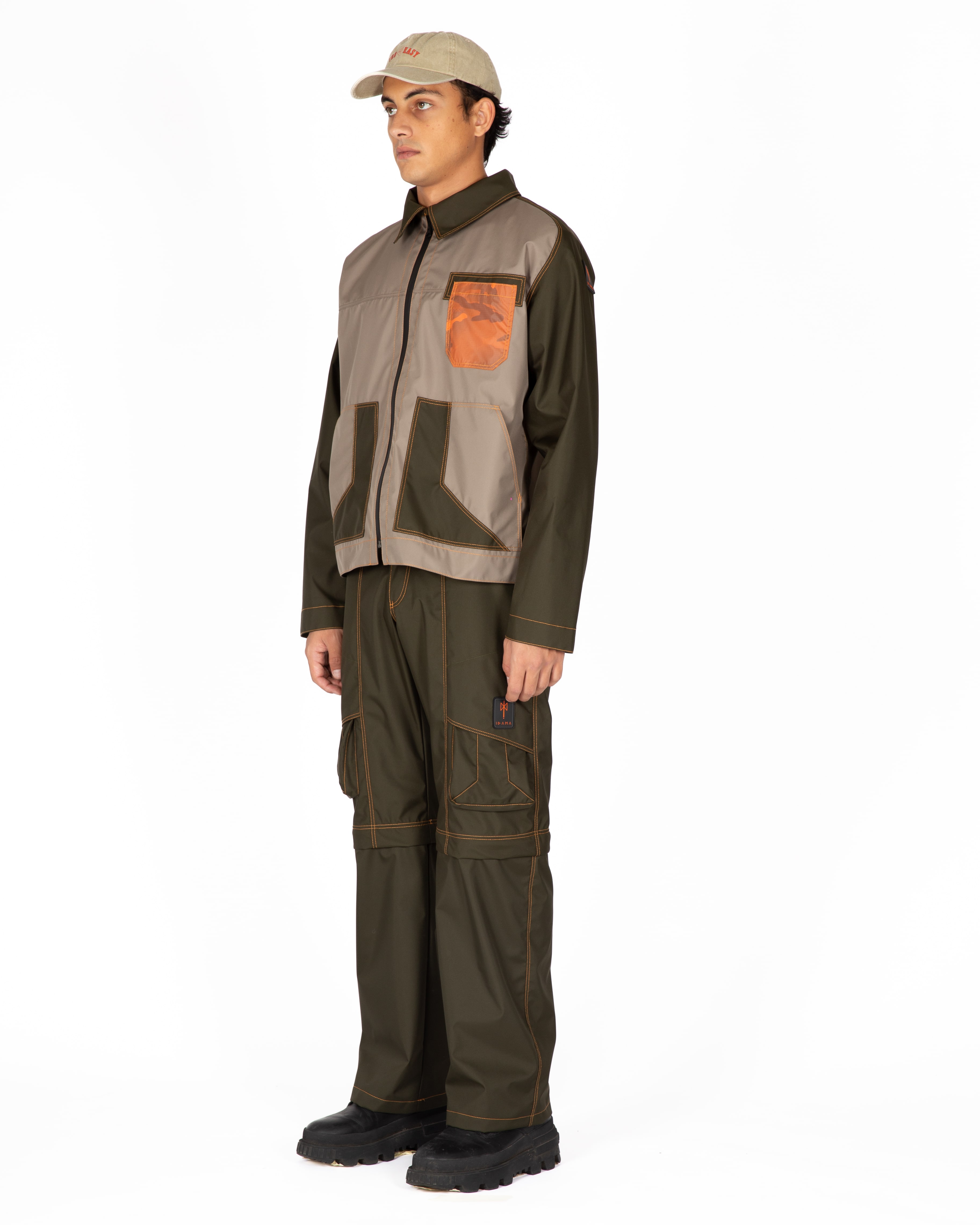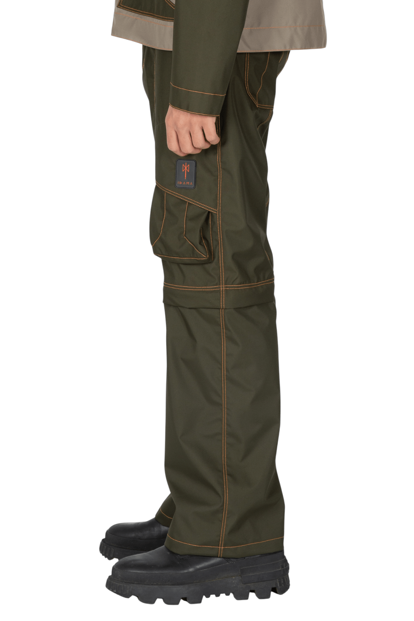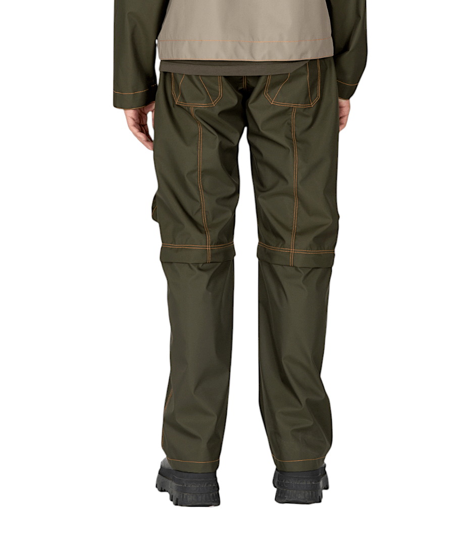 Pantaloni cargo oversize-fit, ispirati al military style, realizzata in gabardine riciclata densa con trattamento idrorepellente C-Zero a triplo strato (PFC-free). Design strutturato, per un mix di utilità contemporanea e stile urbano Con cuciture a contrasto e design versatile, la gamba è removibile tramite una cerniera, trasformando il capo in un pantaloncino tecnico.