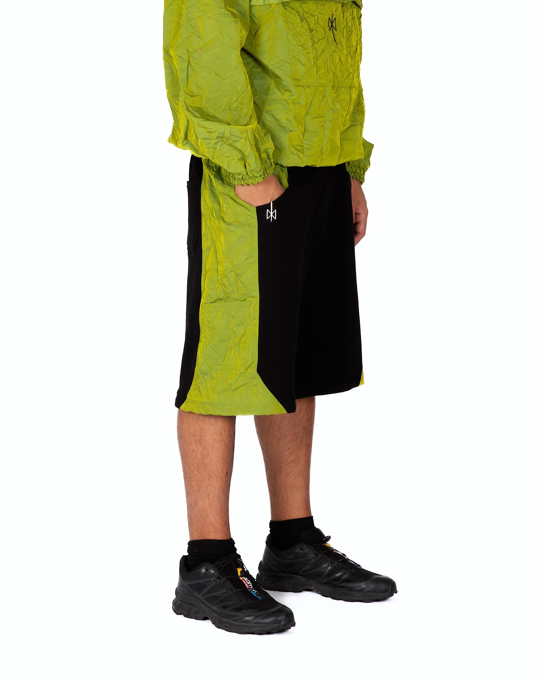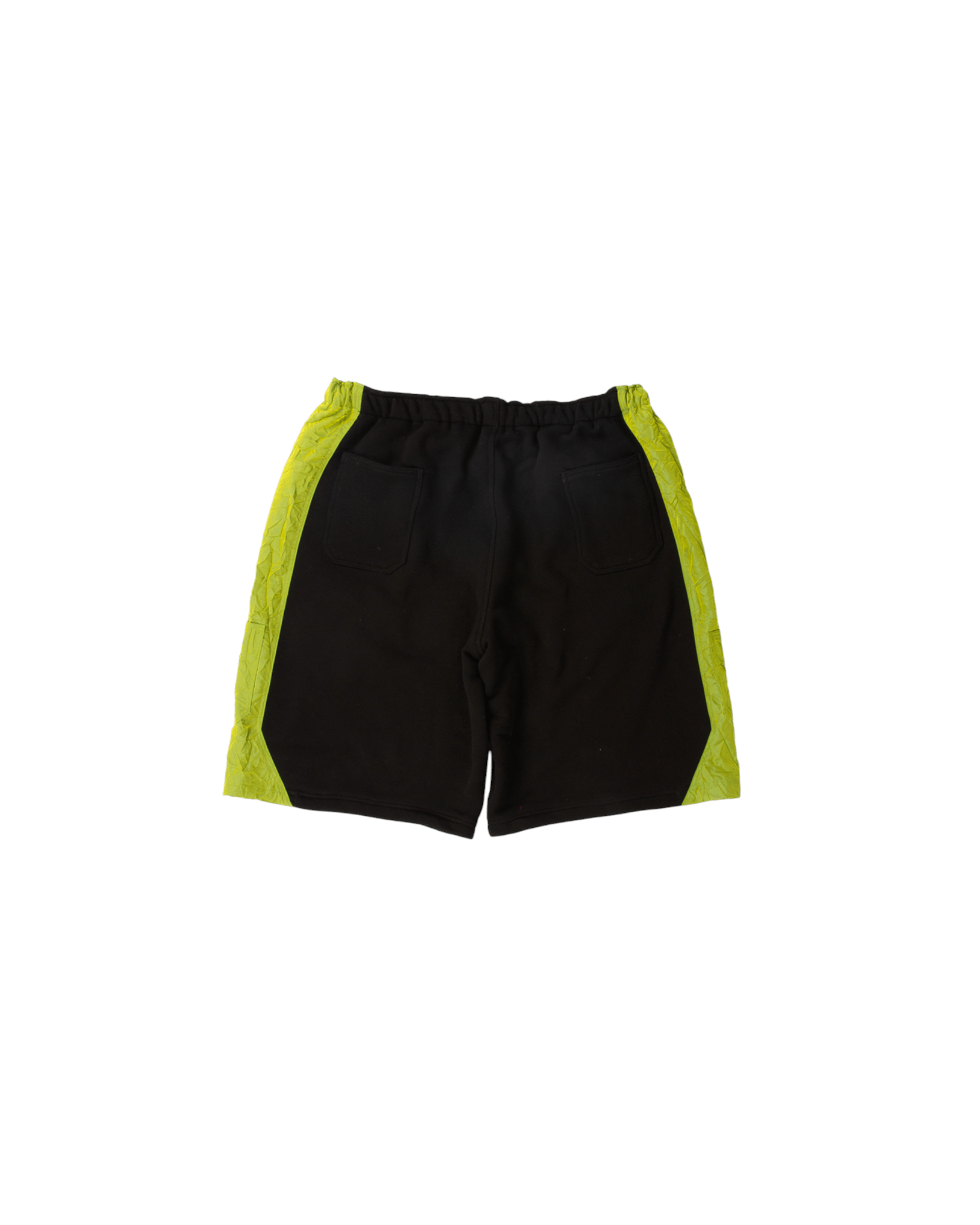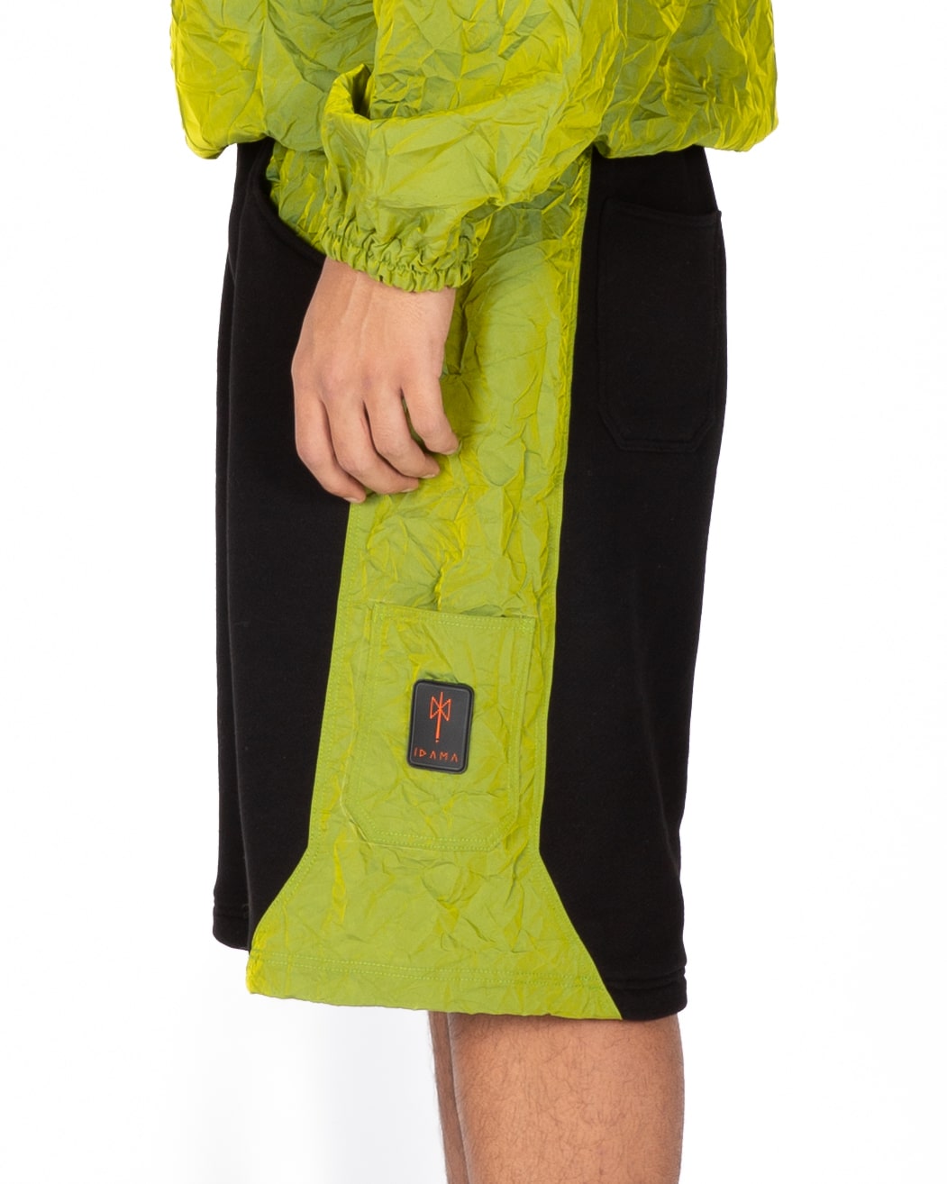 Shorts relaxed-fit nero in cotone morbido italiano, con pannelli laterali iridescenti verde/giallo in nylon-poliestere idrorepellente. Progettati per garantire massima libertà di movimento e uno stile tecnico contemporaneo.