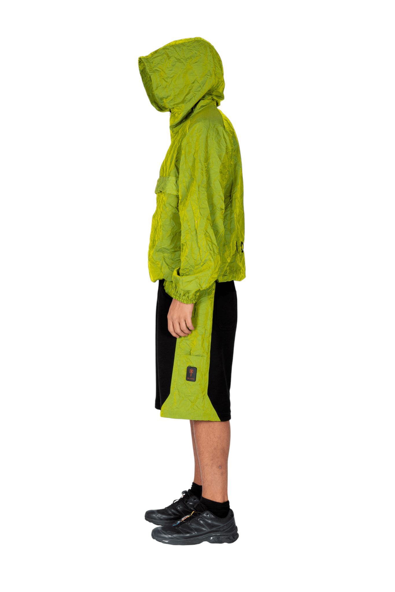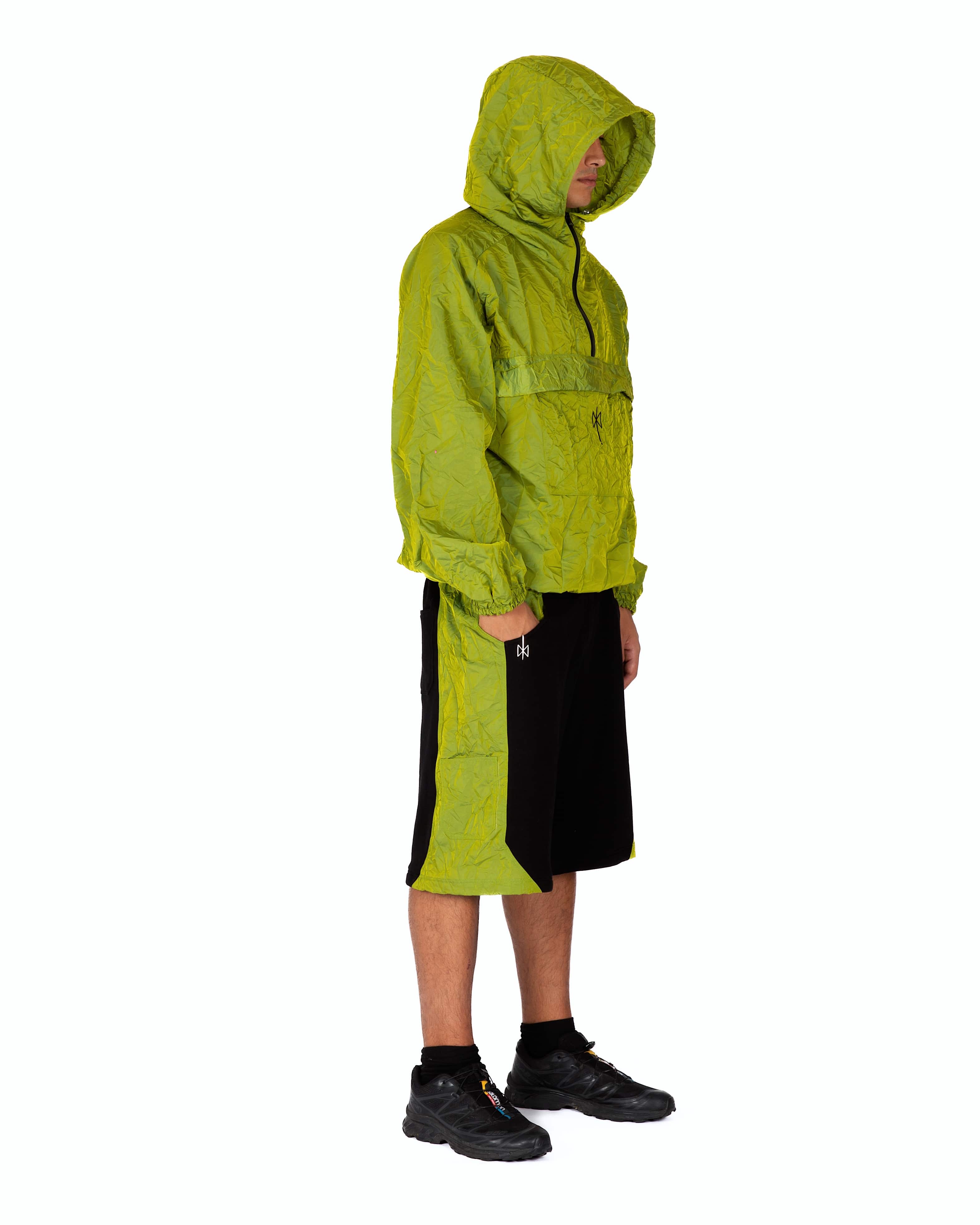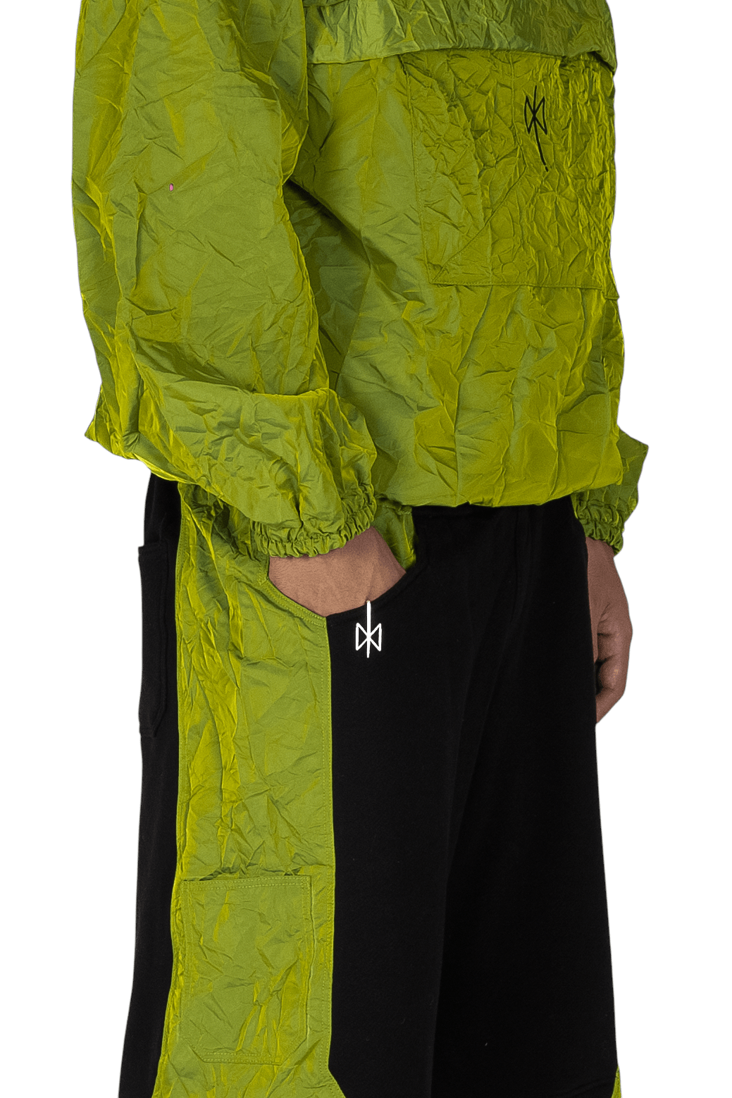 Shorts relaxed-fit nero in cotone morbido italiano, con pannelli laterali iridescenti verde/giallo in nylon-poliestere idrorepellente. Progettati per garantire massima libertà di movimento e uno stile tecnico contemporaneo.