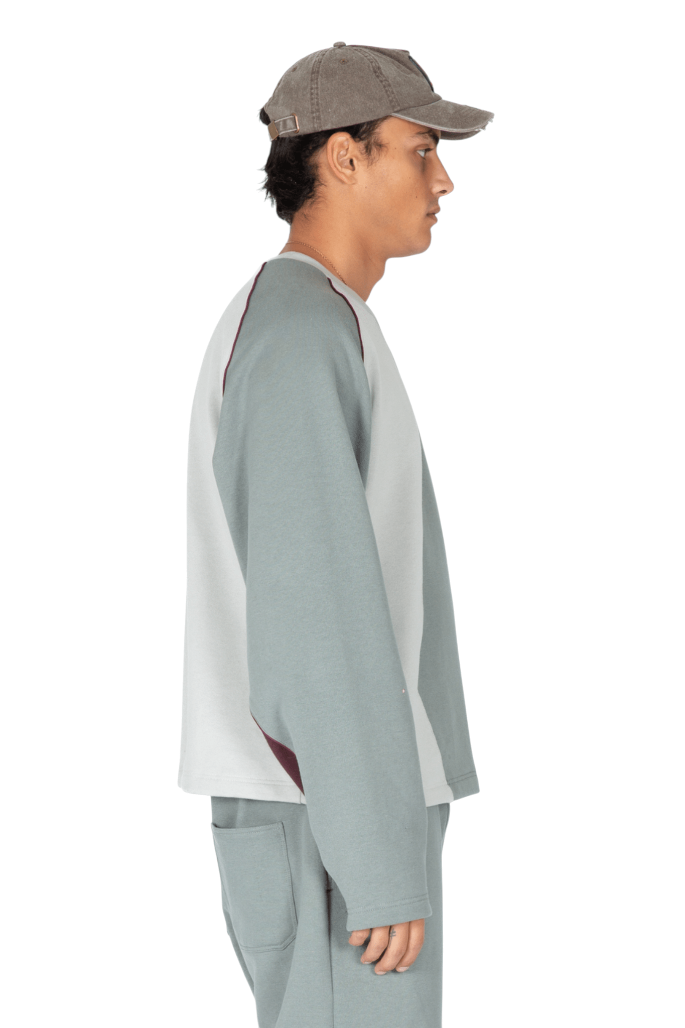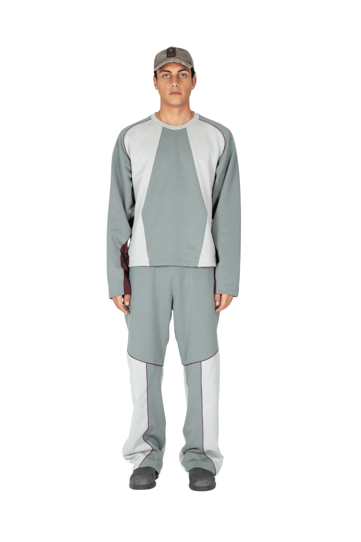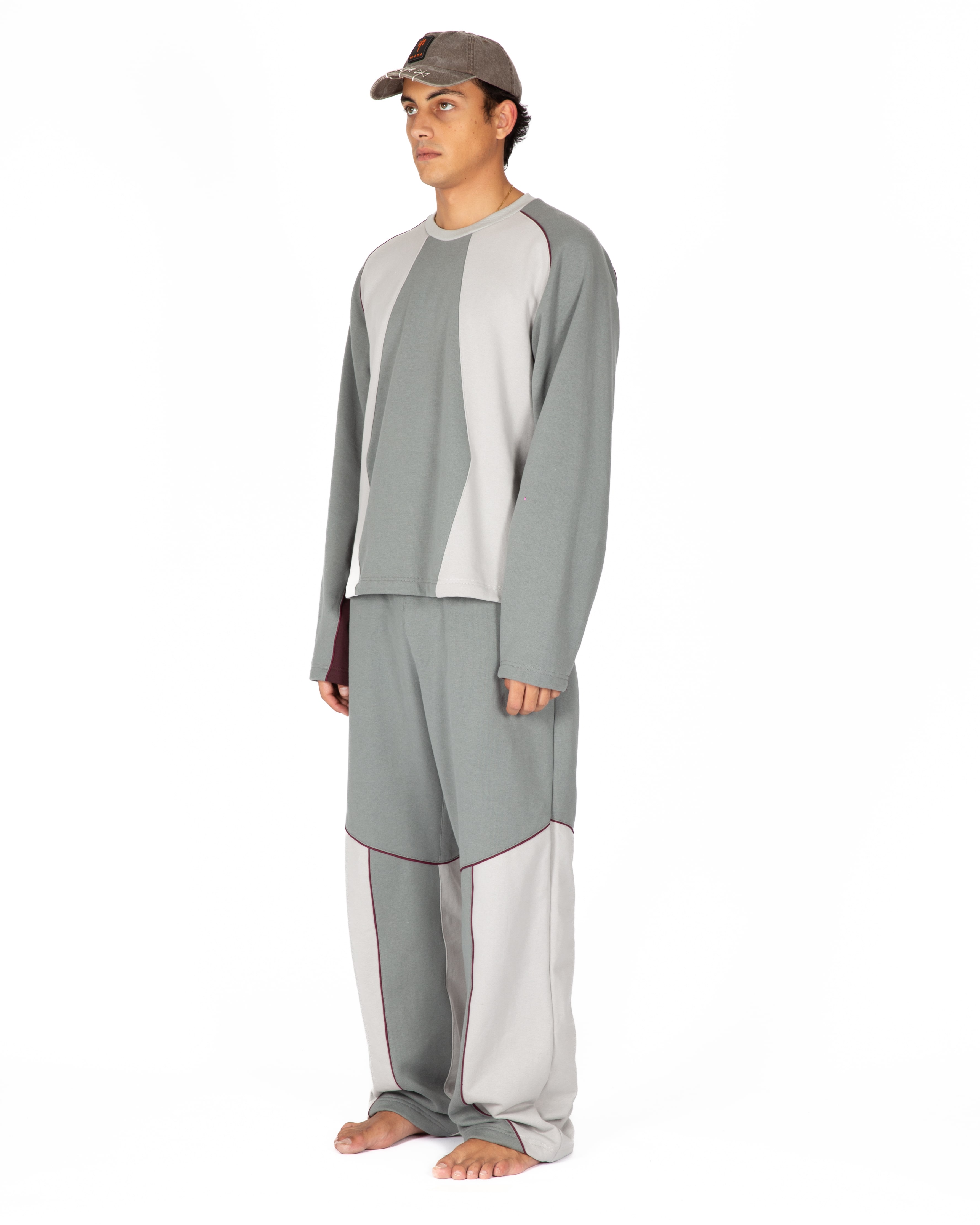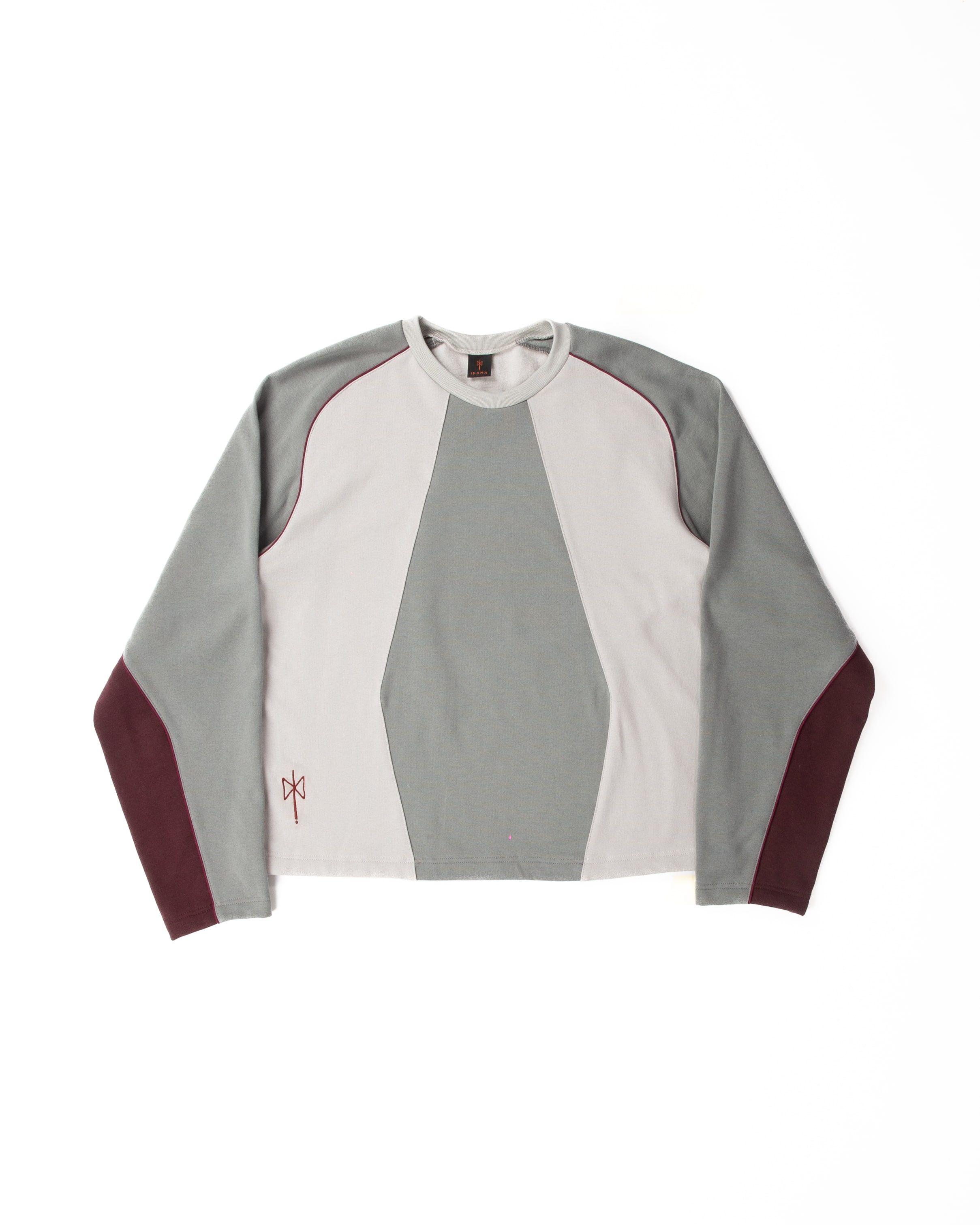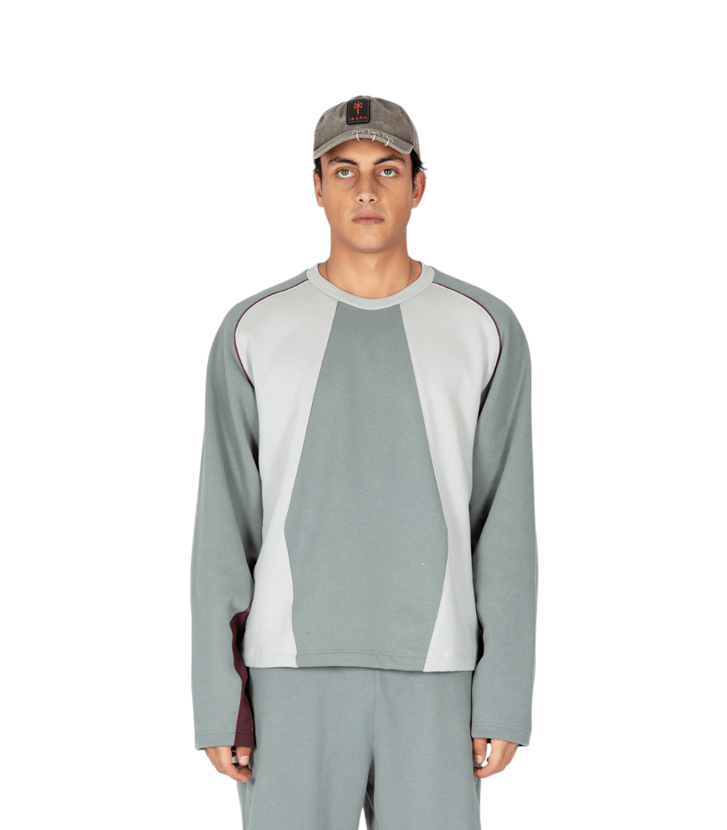 Felpa con vestibilità oversize realizzata in 100% cotone premium con girocollo, concepita per offrire comfort e un’estetica raffinata. Caratterizzata dalla firma costruttiva del brand, presenta una composizione cromatica a pannelli in color grigio ghiaccio e blu, attraversata da un profilo cordonato posizionato con precisione e da un accento di bordeaux sulla manica, che aggiunge un contrasto discreto.