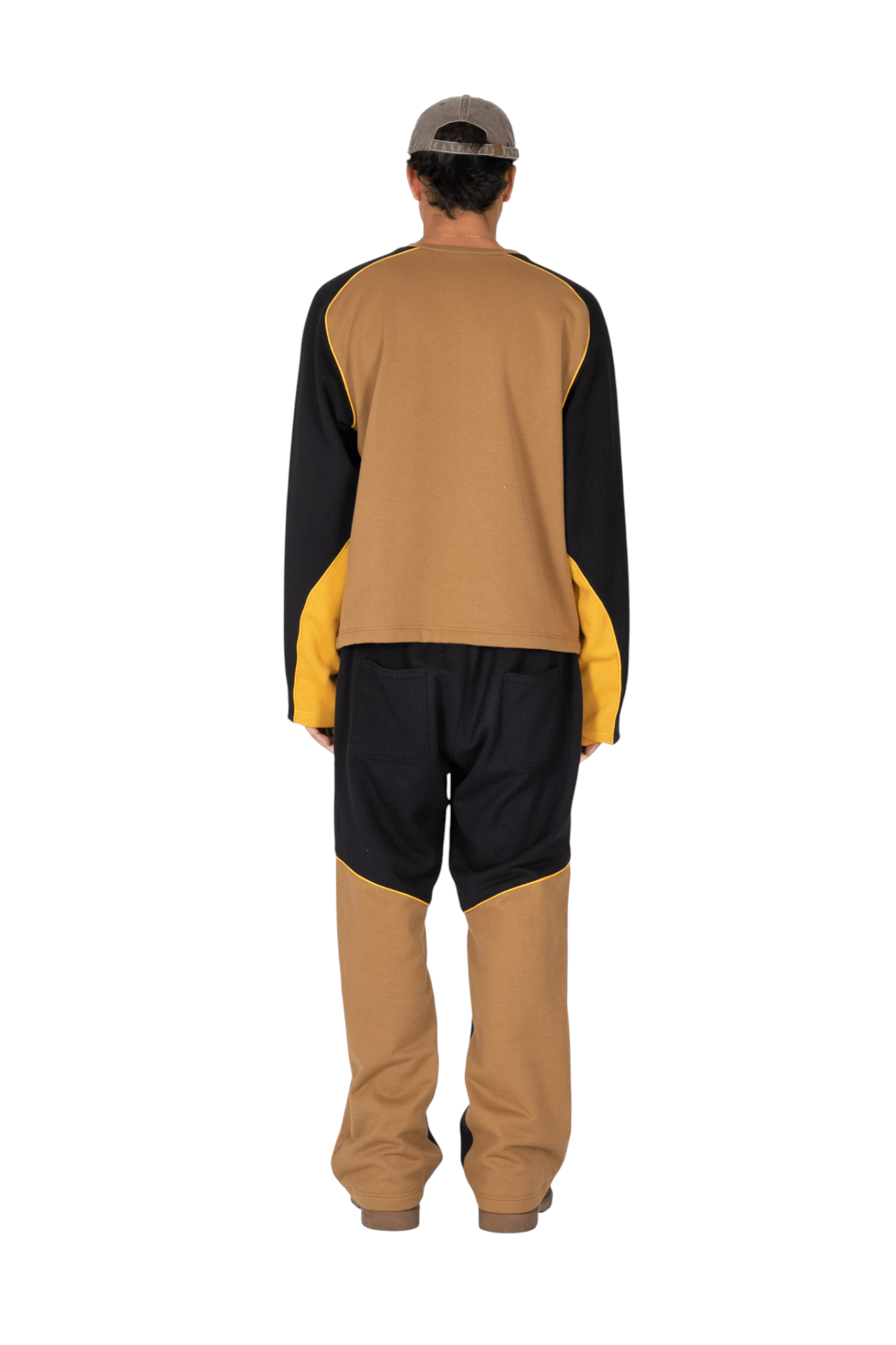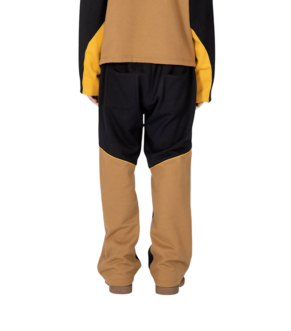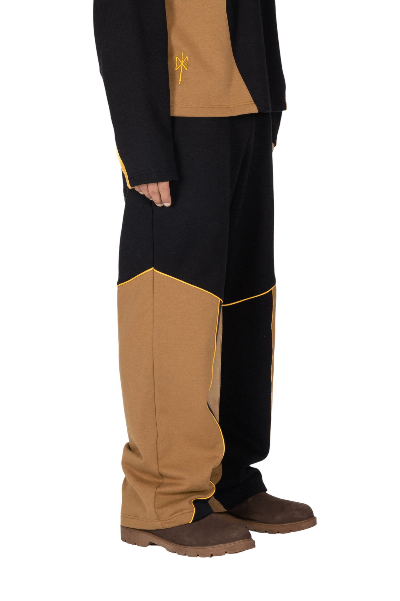 Pantaloni joggers con vestibilità oversize realizzati in morbido e pesante cotone felpato, concepiti per garantire comfort e un’estetica raffinata. Caratterizzati dalla firma costruttiva del brand, presentano una composizione cromatica a pannelli in color sabbia e nero, valorizzata da un profilo cordonato giallo intenso.