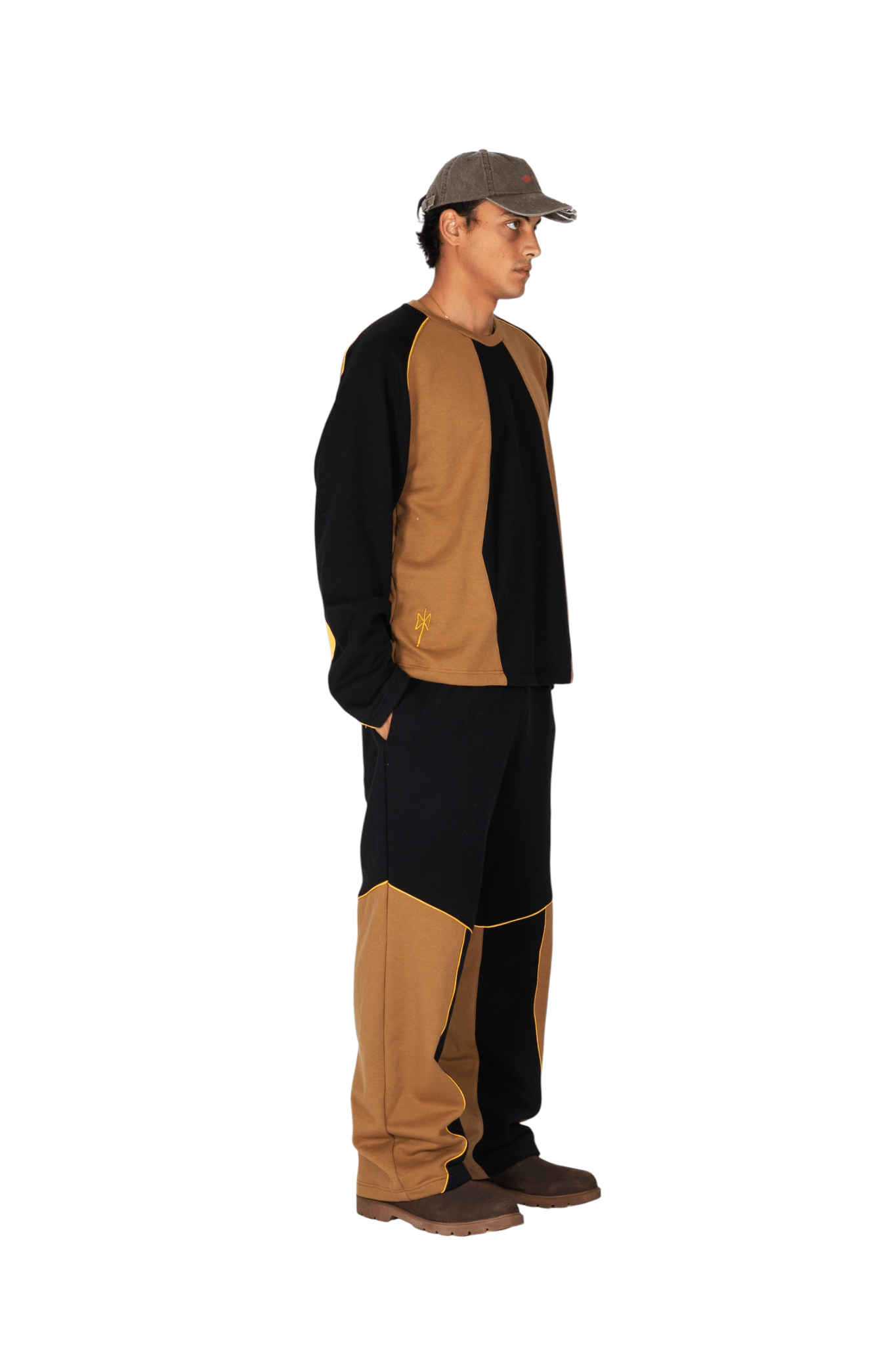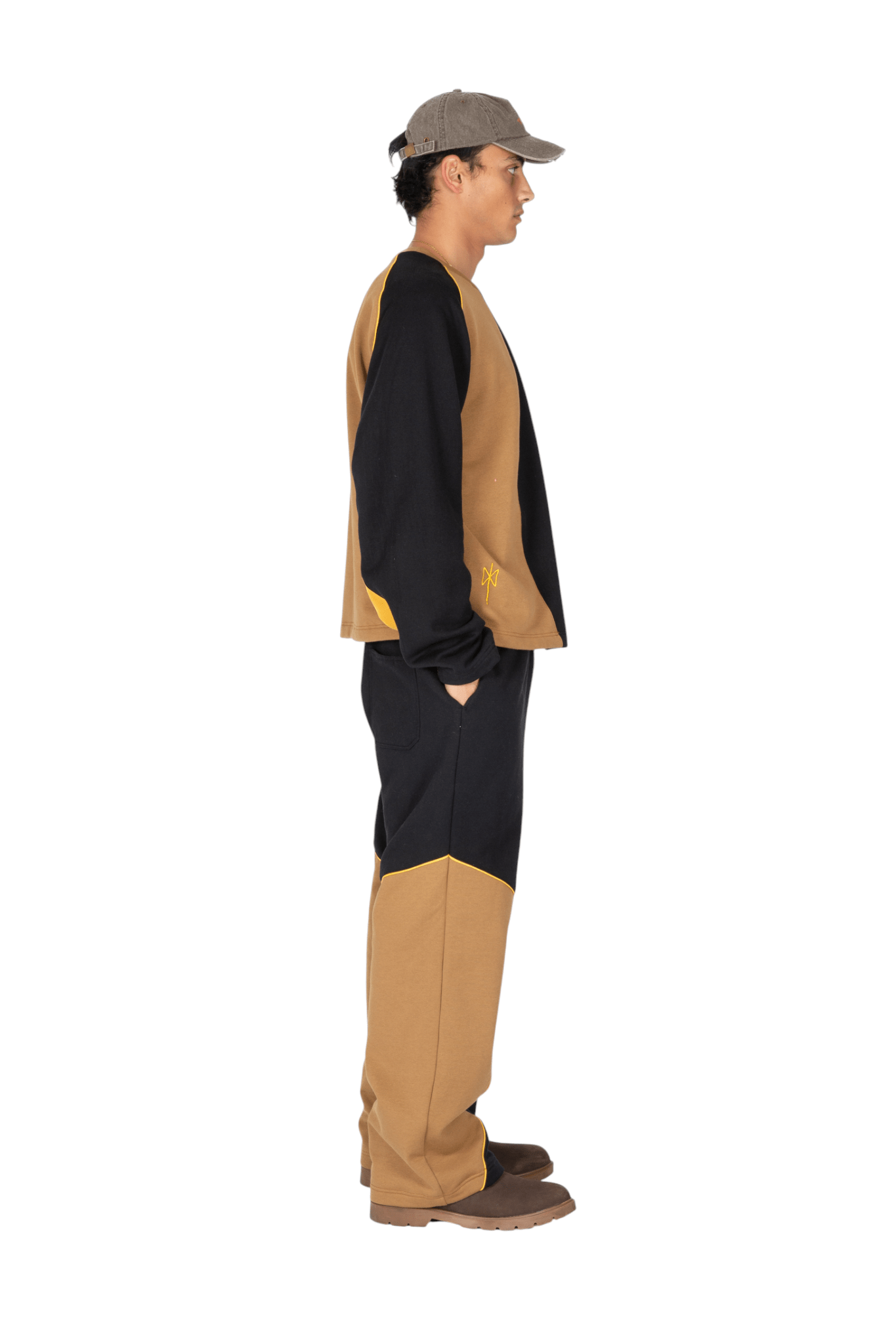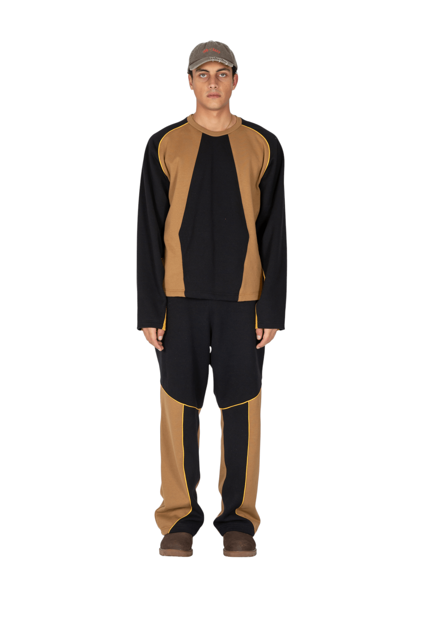 Pantaloni joggers con vestibilità oversize realizzati in morbido e pesante cotone felpato, concepiti per garantire comfort e un’estetica raffinata. Caratterizzati dalla firma costruttiva del brand, presentano una composizione cromatica a pannelli in color sabbia e nero, valorizzata da un profilo cordonato giallo intenso.